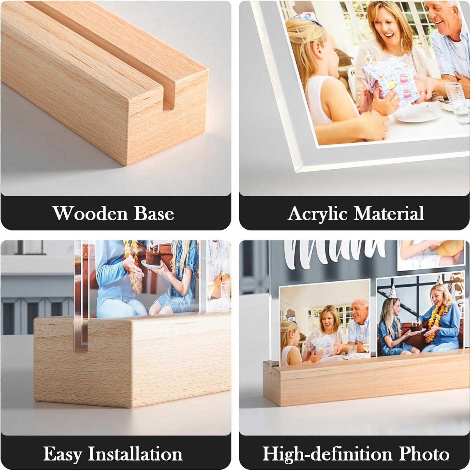 Answer 2: The frames are crafted from high-quality acrylic, which ensures durability and resistance to fading and yellowing over time. This material helps your photos maintain their vibrancy for years.